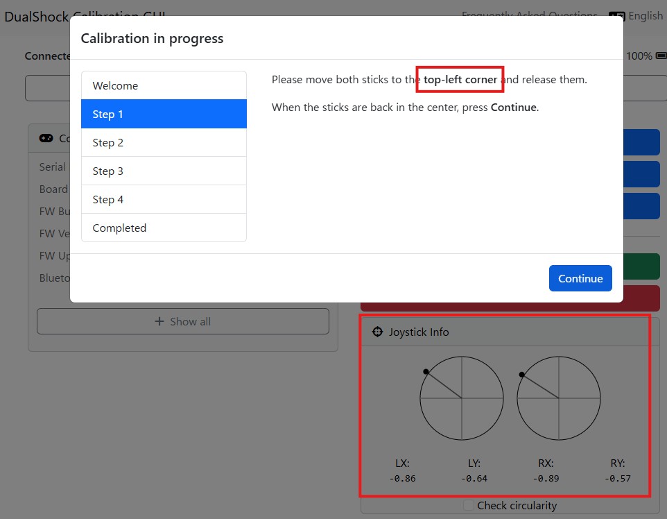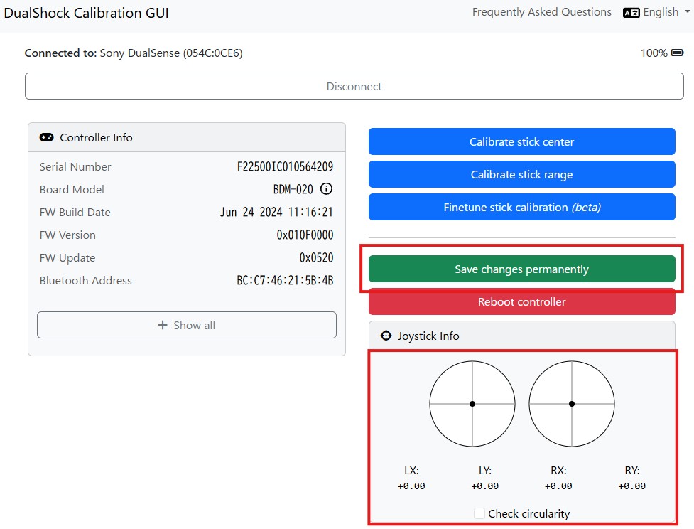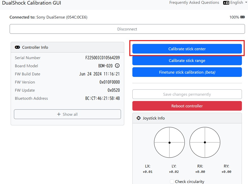 Joystick Info のサークルの点が真ん中にあれば成功です。