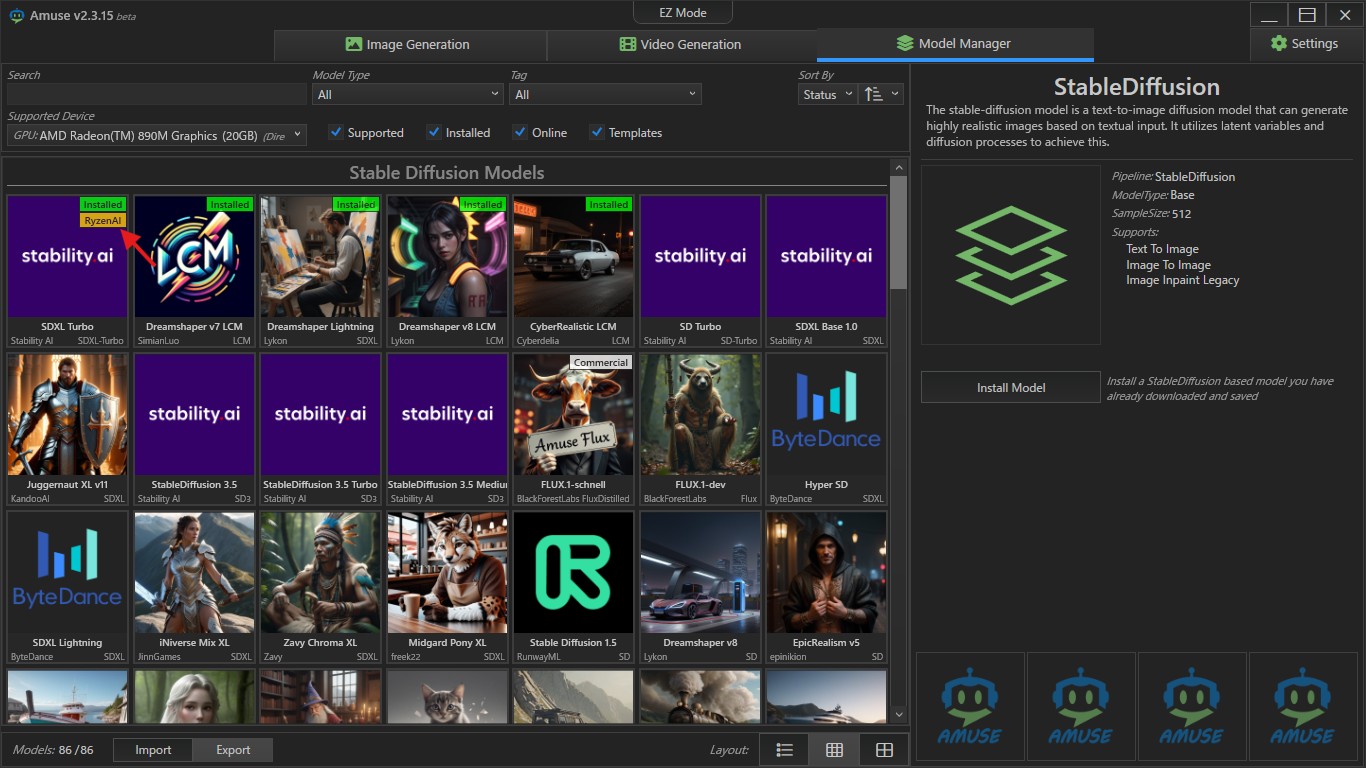モデルの一番左上、 SDXL Turbo のみRyzen AI のラベルが付いていてNPU利用に対応しています。