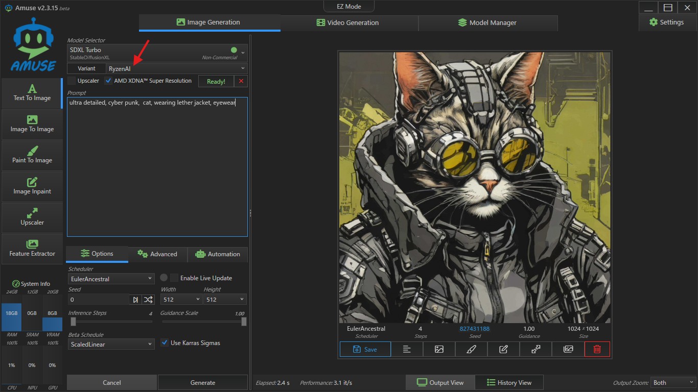 Advansed モードで SDXL Turbo モデルを選択し、 Variant は Ryzen AI にします。
