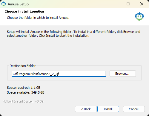 ダウンロードしてきた Amuse_v2.2.2.exe を実行。